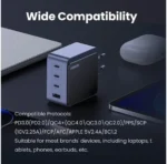 The charger is equipped with 3 USB-C ports and 1 USB-A port, allowing you to charge multiple devices simultaneously without losing speed. Handy if you want to charge your laptop, phone and earbuds at the same time, for example.